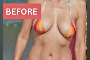 A mature woman in a swimsuit radiates confidence, embracing